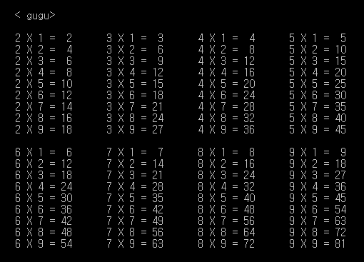 - 각 단은 탭으로 분리하며, 총 4단씩 묶어 출력한다. 묶음과 묶음 사이에는 빈 줄이 추가되어야 한다.